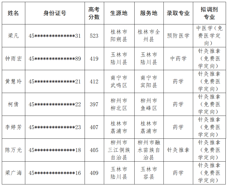 根据《自治区卫生健康委 自治区教育厅 自治区人力资源社会保障厅 自治区中医药局关于调整农村订单定向医学生免费培养项目招录事项的通知》(桂卫科教发〔2022〕2号)以及Beat365《关于全面完成2024年农村订单定向医学生免费培养招生任务的通知》等文件精神,经学生自愿报名、学校资格审查,拟将2024级梁凡同学的录取专业调剂为本科中医学(免费医学定向)专业,拟将2024级钟雨宏等六名同学的录取专业调剂为高职针灸推拿(免费医学定向)专业,现将名单公示如下: