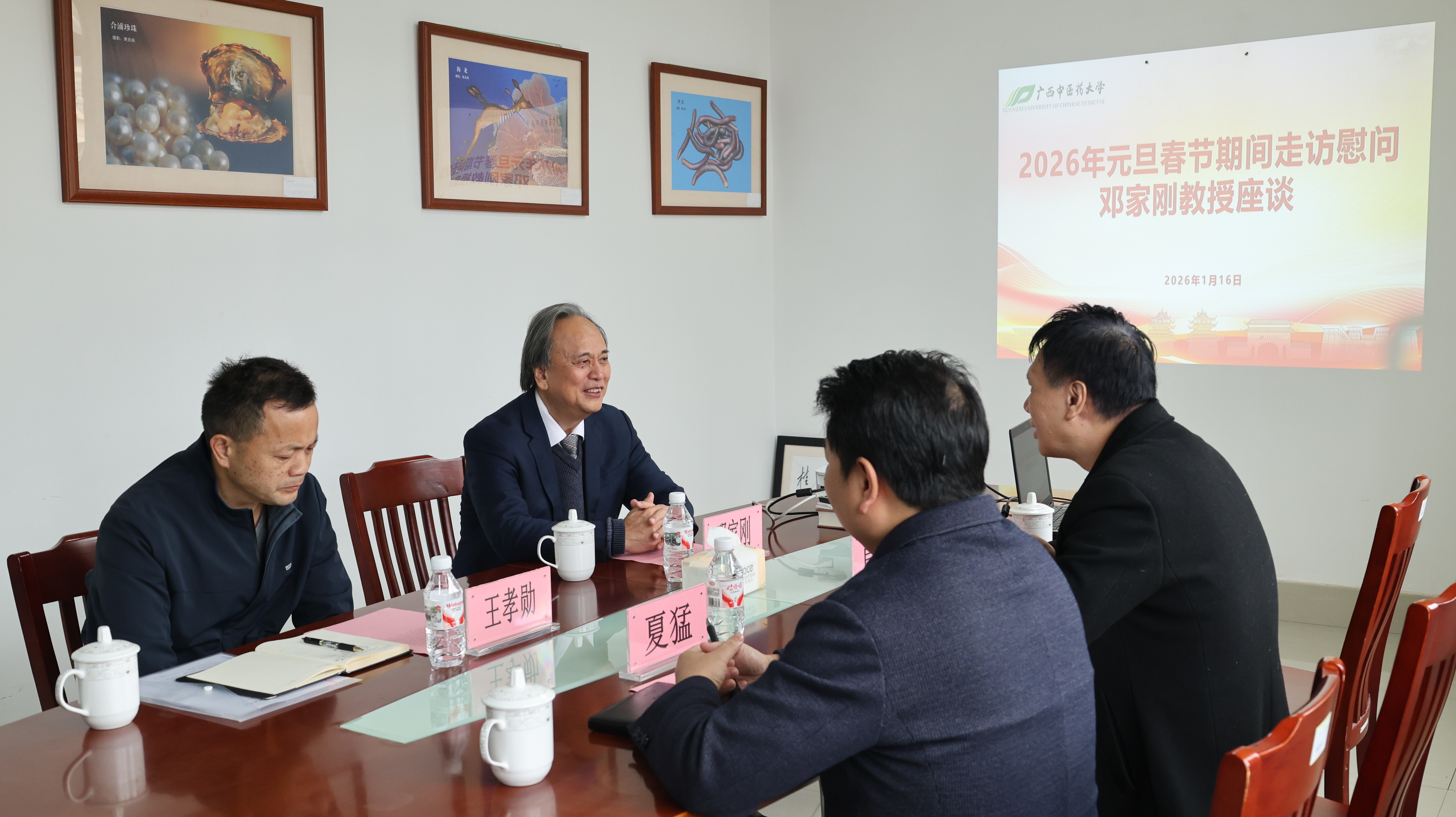2026年1月16日下午,新春佳节前夕,Beat365中国唯一官方网站副校长肖健一行赴广西中药药效研究重点实验室看望慰问实验室名誉主任、特聘专家顾问邓家刚教授。学校科技处处长夏猛同志、中医药壮药医药研究院院长王孝勋同志等陪同慰问。座谈会上,肖健副校长代表学校向邓家刚教授致以诚挚的节日问候,并充分肯定了邓家刚教授在中药民族药研究领域的突出成就及贡献。会后,慰问团一行与邓家刚教授、实验室团队成员进行了合影留念。此次慰问活动体现了学校对高层次人才的深切关怀,也彰显了尊师重教、传承创新的校园文化。
