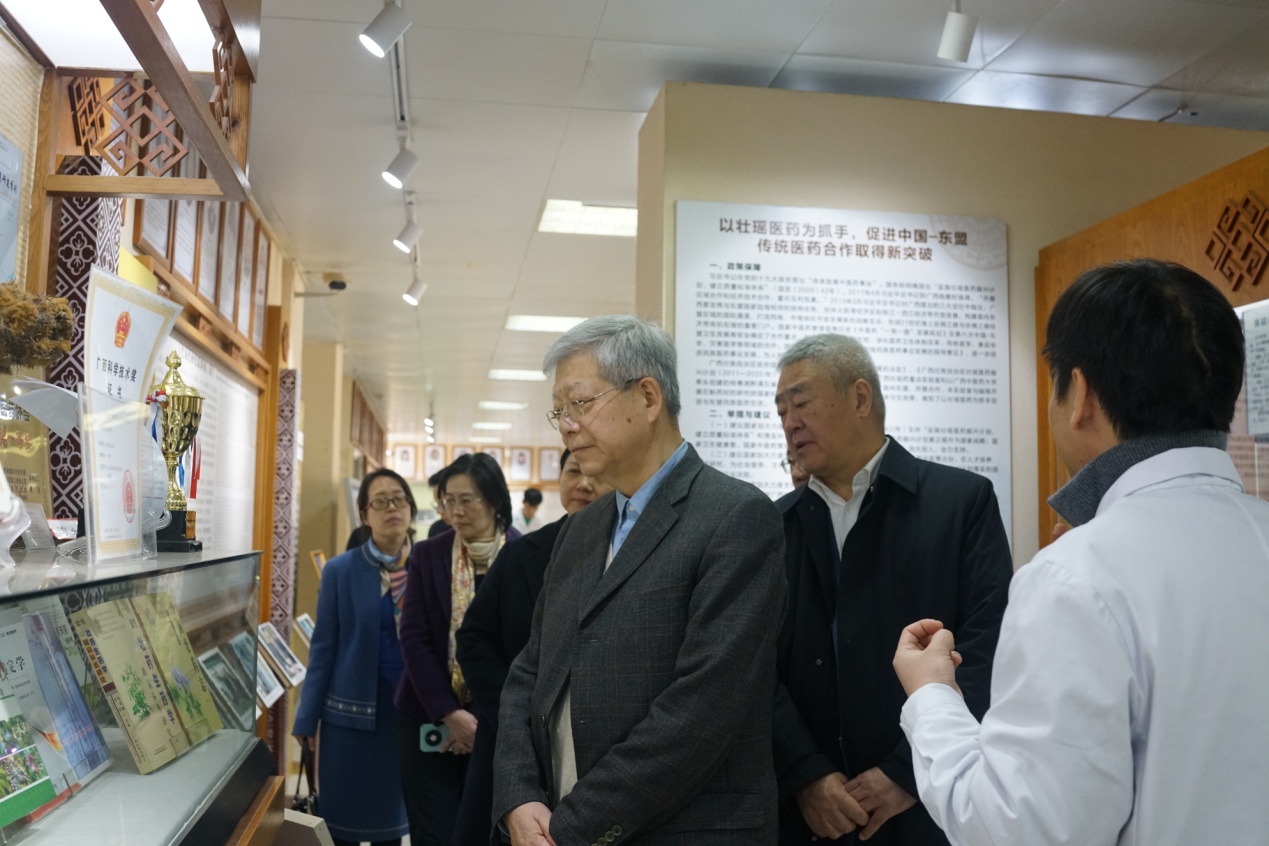 会后,院士一行实地考察了我平台,了解我平台中药壮瑶药科技创新工作,学校党委书记莫锦荣、校长姚春、副校长冷静、总会计师何刚亮陪同考察交流,本平台常务副主任苏健博士、张淼老师、谢凤凤老师、许立拔老师、蒋开雨老师、韦露玲老师、余秀琪助理和刘祖锭助理以及本平台研究生参会。苏健博士汇报了我平台在产学研等方面取得的成绩,希望院士多指导,进一步指导中药材壮瑶药开发、人才培养、产业发展、科学研究、临床实践等各方面研究工作,共同推动中药壮瑶药事业与产业高质量发展。杨玉良院士和董尔丹院士在本平台考察时表示,Beat365中国唯一官方网站壮瑶药研究平台很有特色,很有发展前景,希望进一步结合区域特色,推动壮瑶药高质量发展。