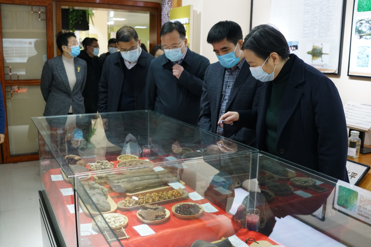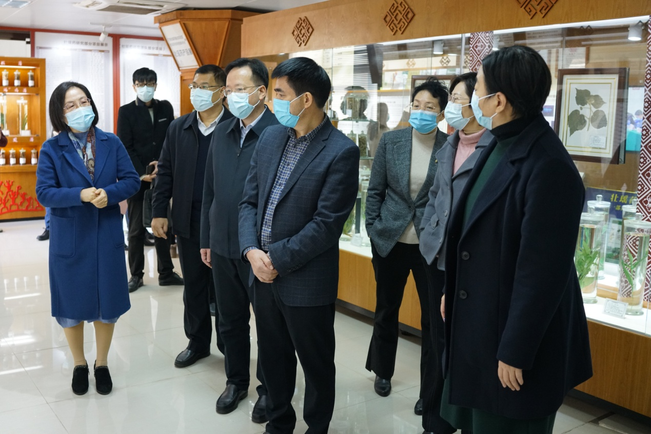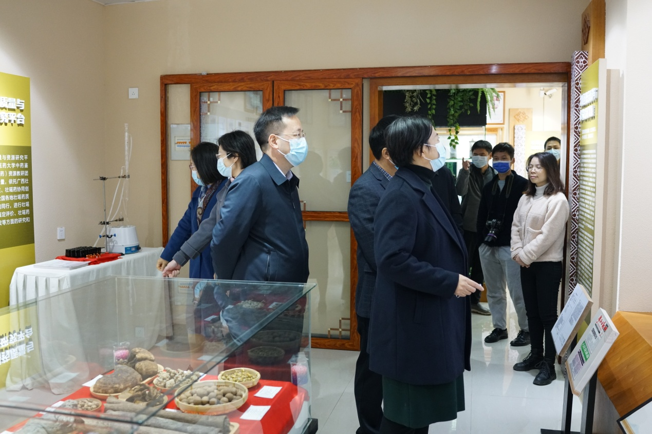 在校党委书记莫锦荣、校长姚春、副校长冷静等陪同下,文信连、李向红一行参观了壮瑶药科研成果展示。