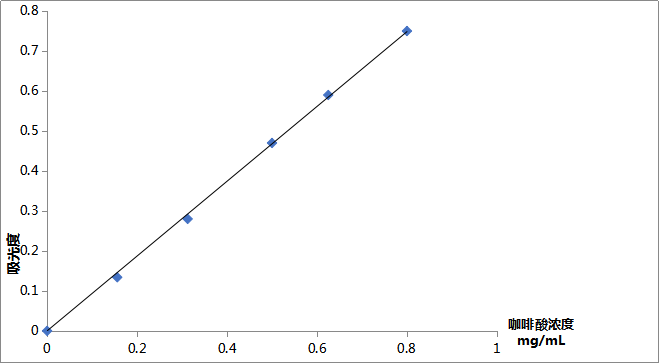 分别称量咖啡酸标准品用甲醇将其定容到25mL的容量瓶中,稀释浓度分别为1mg/mL、2 mg/mL、3 mg/mL、4 mg/mL、5mg/mL的标准溶液。最后以X轴和Y轴分别表示质量浓度(mg/mL)和吸光度(Abs),得到回归方程是 y= 0.949x- 0.0079 , R2 = 0.9995。
