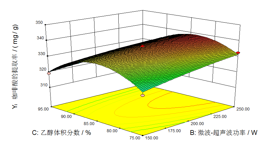 图 7、图 8 和图9所示,不同的微波-超声波功率、反应时间和乙醇体积分数对咖啡酸提取率的交互效应。1. 在微波-超声波功率恒定时,随着反应时间的递增,咖啡酸的提取率略有些增加,但变化的幅度不明显;以乙醇的体积分数递增,咖啡酸的提取率出现先升后降的趋向。2. 在反应时间恒定时,随着微波-超声波功率的递增,咖啡酸的提取率出现先升后降的趋向,并且在15 min 左右有峰值出现;以乙醇体积分数的增加,咖啡酸的提取率先上升后下降,且变化趋势明显。3. 在乙醇体积分数恒定的条件下,随着反应时间的递增,咖啡酸的提取率出现“先升后降”的趋向,但变化的幅度不明显。以微波-超声波功率的递增,咖啡酸的提取率变化不大。