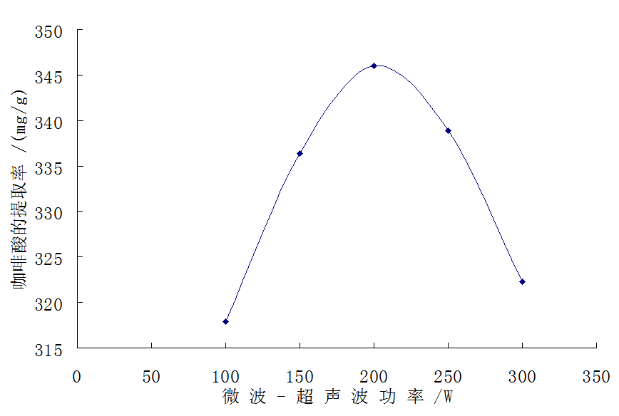 称量一匹绸,每份2.0g,30℃,、85%乙醇、反应时间20min、料液比1:70,分别用微波-超声波功率100、150、200、250、300w,得出最佳提取微波-超声波功率是200W。