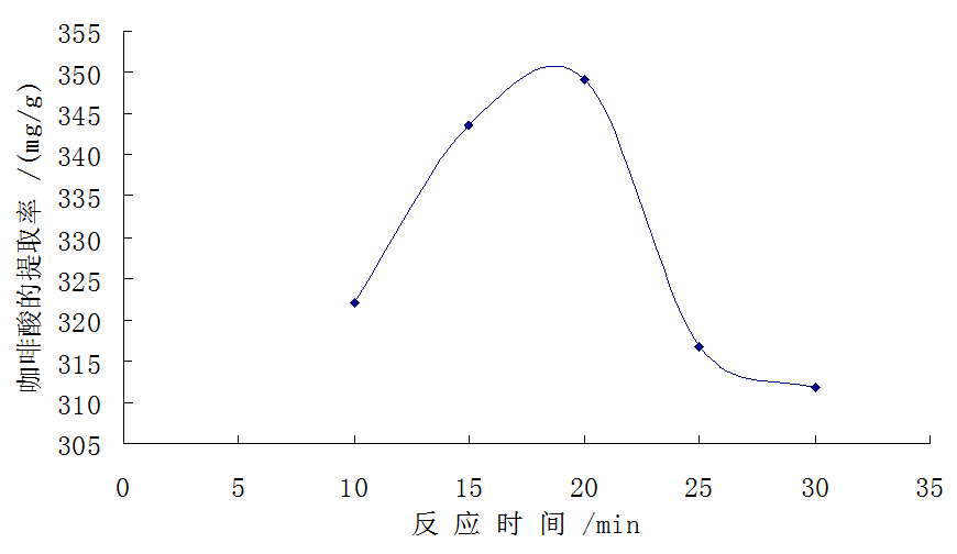 称量一匹绸五份,每份2.0g,微波-超声波功率300W、料液比为1:90、乙醇体积分数95%, 30℃,分别提取10min、15min、20min、25min和30min ,得出咖啡酸最佳提取工艺的反应时间是20min。