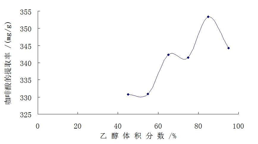 称量一匹绸,每份2.0g,30℃,微波-超声波功率300W、、反应时间20min、料液比为1:90。依次用45%、55%、65%、75%、85%、95%的乙醇溶液提取一匹绸咖啡酸,最佳提取工艺的乙醇体积分数是85%。