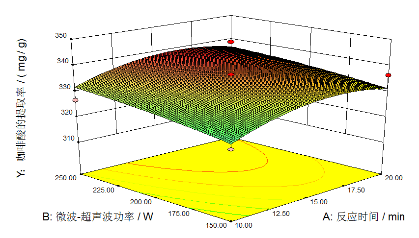 由表4可知,由Design-Expert.V 8.0.6软件设计分析得到的最优方案,即本实验理论最佳的反应时间(A)为16.60 min、最优的微波-超声波功率(B)为250.00 W、最优的乙醇体积分数为83.07 %,咖啡酸的提取率Y=339.71 mg/g 。
