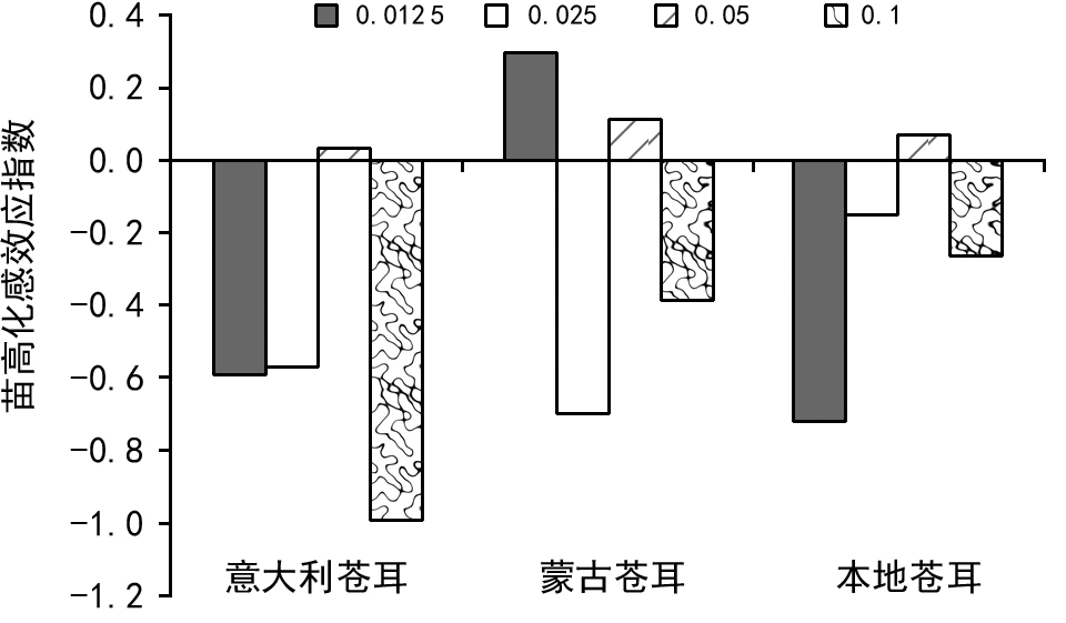 由图3和图4可以看出,不同浸提液、不同浓度的 处理对小白菜幼苗苗高均有一定影响,且差异显著。苗高 RI 值显示,供体种类不同,抑制的起始浓度不同。低浓度中,以 蒙古苍耳浸提液浓度为 0.0125g/mL时促进作用最大,其次是意大利苍耳;高浓度则以意大利苍耳浸提液浓度为0.1g/mL 时化感抑制作用最大,其次是蒙古苍耳。