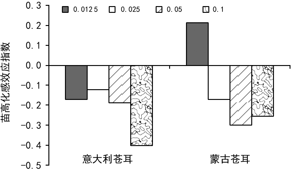 由图7、图8可看出,2种外来入侵苍耳子浸提液处理后的苍耳种子发芽率始终呈化感抑制作用;当浓度为0.1g/mL时,蒙古苍耳子浸提液处理比意大利苍耳子浸提液处理对本地苍耳种子的化感抑制作用更强。