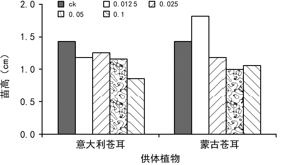 由图9、图10可看出,本土苍耳苗高显示,蒙古苍耳子水浸提液对苍耳幼苗苗高呈低促高抑的化感作用,而意大利苍耳子处理化感抑制作用随浓度的增加而增大。