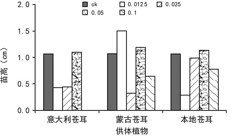 图3 不同种来源苍耳子浸提液、不同浓度处理对小白菜种子苗高比较