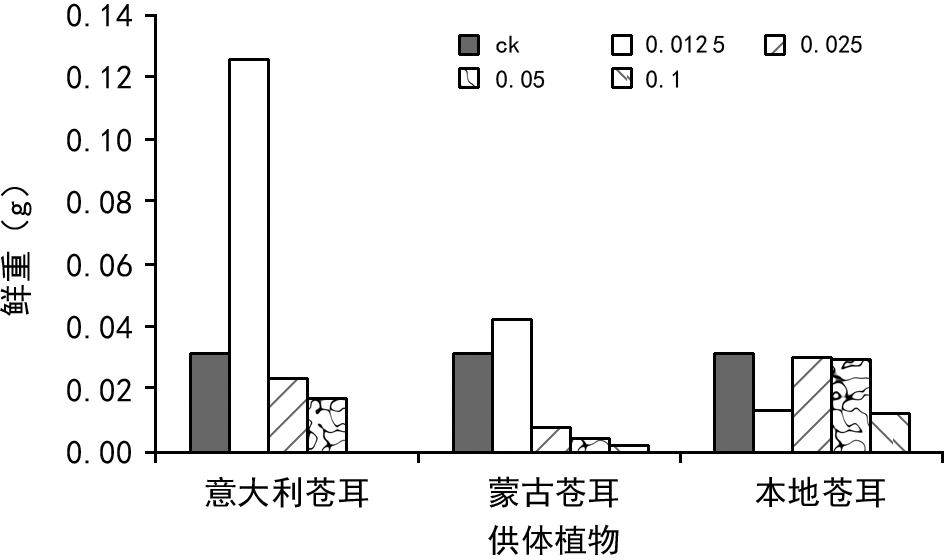 图11 2种外来入侵苍耳子浸提液、不同浓度处理对本土苍耳幼苗鲜重的比较