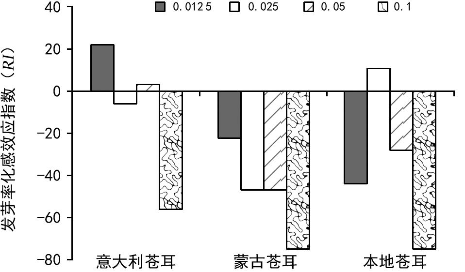 对生态环境资源的竞争力。从发芽率 RI 值可以看出,浓度为0.1g/mL 时,蒙古苍耳处理比意大利苍耳处理对本地苍耳子的化感抑制作用更强。