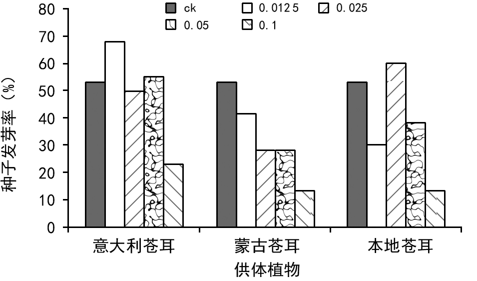 种子萌发对物种的更新至关重要,种子发芽率的下降则将降低受体在植物群落中的多度和早期竞争力,相应地提高供体植物对地上和地下资源的竞争能力。由此可知,外来入侵植物意大利苍耳和蒙古苍耳可以通过抑制本地苍耳种子的萌发,从而提高其各自