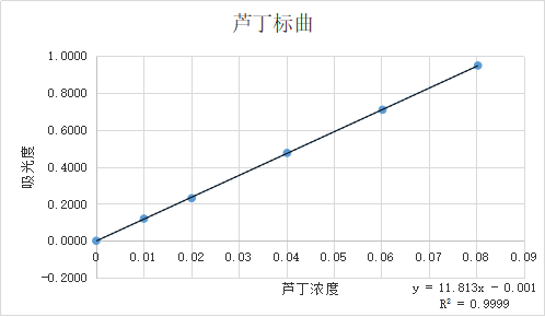 用移液枪精密移取上述制备的芦丁对照品溶液0mL、0.1mL、0.5mL、1mL、2mL、3mL分别置于10mL容量瓶中,用1ml的移液管移取5%NaNO2溶液0.5mL,上下轻轻翻转,摇匀,静置5min后,用移液管移取10%Al(NO3)3溶液0.5mL,摇匀,放置5min,再用移液管移取4%NaOH溶液5mL,最后用滴管加入50%乙醇溶液至刻度线处,上下轻轻翻转,摇匀,放置10min,用50%乙醇作空白对照溶液,测出波长503nm处测定不同浓度芦丁的吸光度,平行测试3次,即得芦丁对照品溶液的校准曲线。采用最小二乘法进行回归计算,即可得到吸光度值(Y)与芦丁标准溶液的溶度(X)的关系曲线:Y=11.813x-0.001,相关系数为 R2=0.9999。结果显示,芦丁标准溶液在(0.004-0.12)mg/ml浓度范围内与吸光度线性关系良好,结果见表4-1,见图1-2。