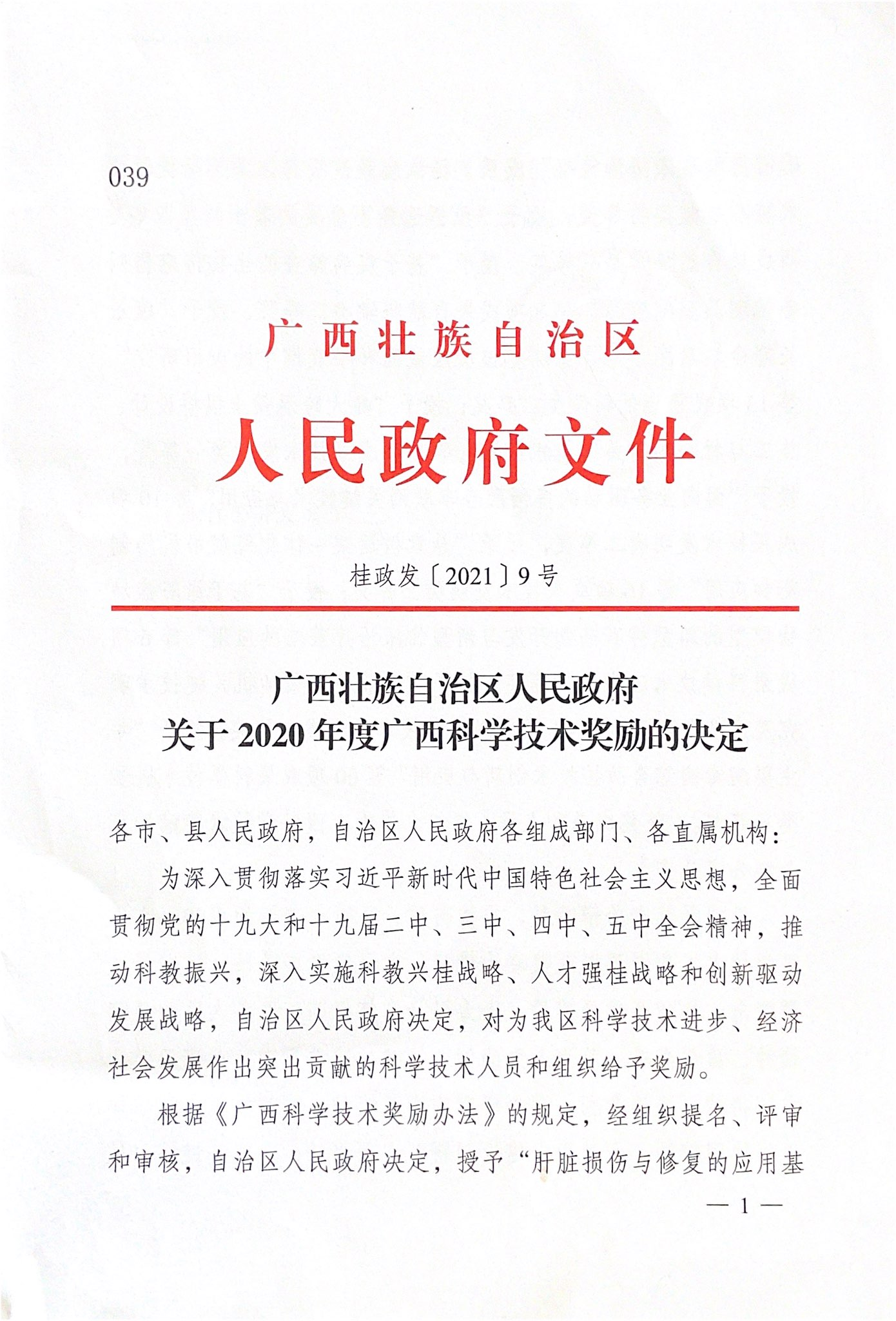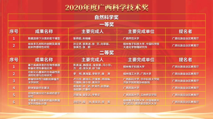 为深入贯彻落实习近平新时代中国特色社会主义思想,全面贯彻党的十九大和十九届二中、三中、四中、五中全会精神,推动振兴,深入实施科教兴桂战略、人才强桂战略和创新驱动发展战略,自治区人民政府对全区科学技术进步、经济发展做出突出贡献的科学技术人员和组织予以奖励。《广西壮族自治区人民政府关于2020年度广西科学技术奖励的决定》(桂政发〔2021〕9号)显示,共有160项科技成果获得2020年度广西科学技术奖。Beat365作为第一完成单位有4项科技成果喜获“2020年度广西科学技术奖”,其中我平台朱华教授等主持科技成果喜获“2020年度广西科学技术奖”自然科学奖二等奖(本年度广西中医药民族医药获政府奖自然科学类最高奖项之一)。