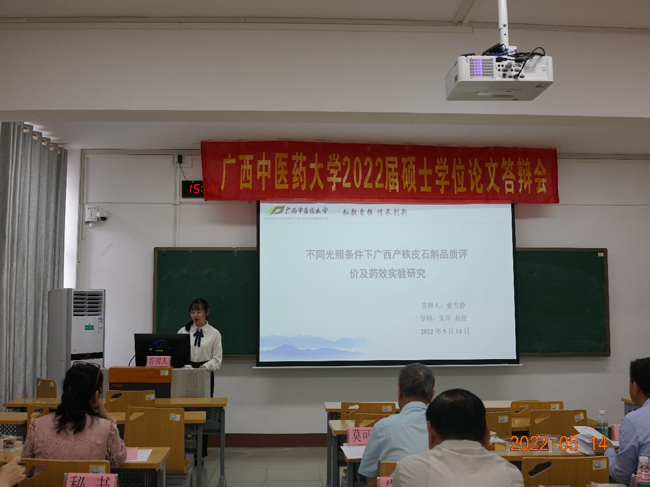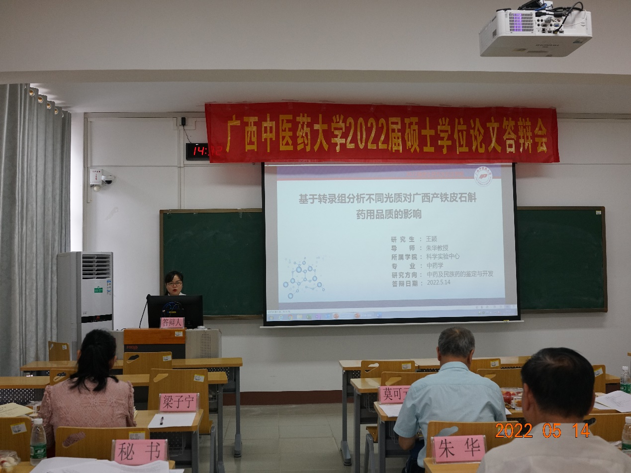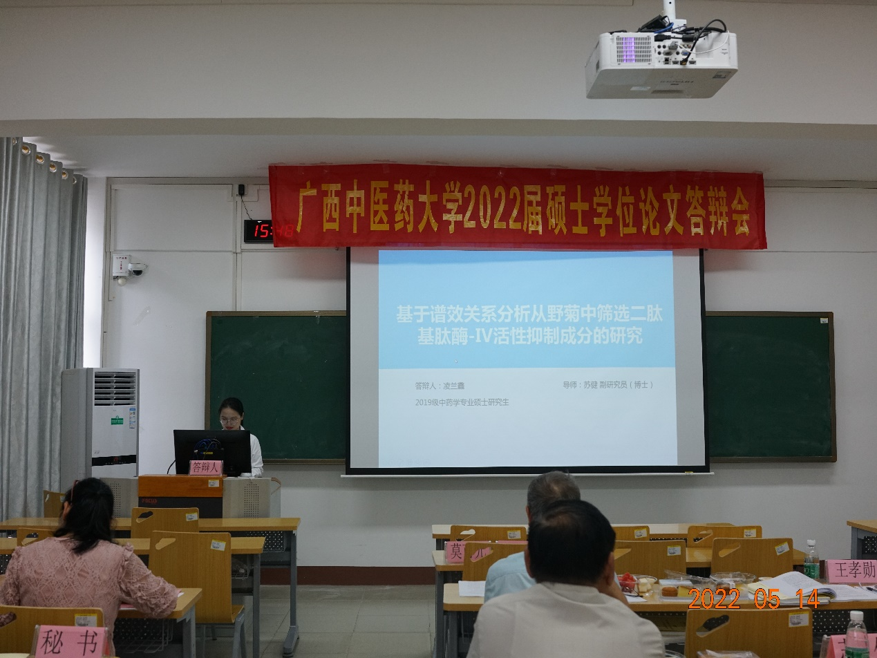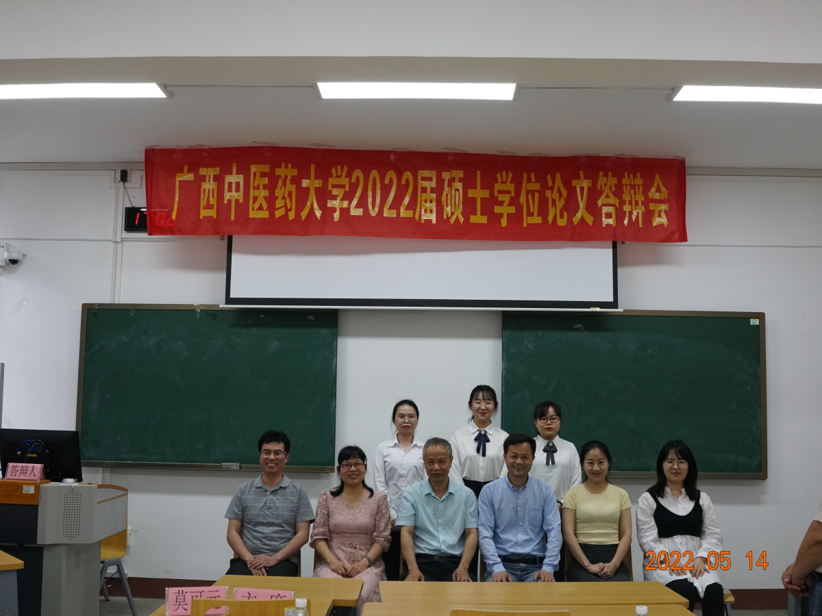 5月14日下午,平台实验室硕士研究生毕业答辩会于Beat365中国唯一官方网站明秀校区时珍楼6-606教室顺利召开。本次答辩对象为2019级研究生。答辩会主席为自治区人民医院莫可元主任中药师,答辩委员会委员有Beat365中国唯一官方网站梁子宁博士教授、王孝勋博士研究员、梁爽高级实验师、戴忠华博士副教授,答辩秘书张淼老师。