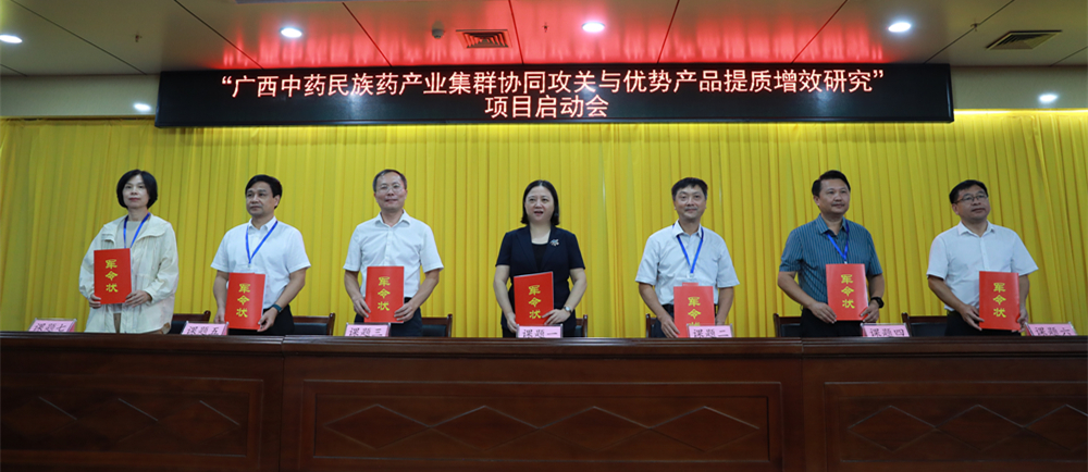 莫锦荣在致辞中表示,学校坚持把服务壮美广西建设作为使命担当,充分发挥科技、人才、平台等优势,积极与国内外科研院所、地方政府和企业深化校地合作、校企合作,推动产学研用深度融合,助力广西中药民族药产业发展。莫锦荣希望项目组成员进一步增强责任感和使命感,紧紧围绕项目预期目标,瞄准主攻方向,协同开展攻关,力争产出一批高质量的研究成果。