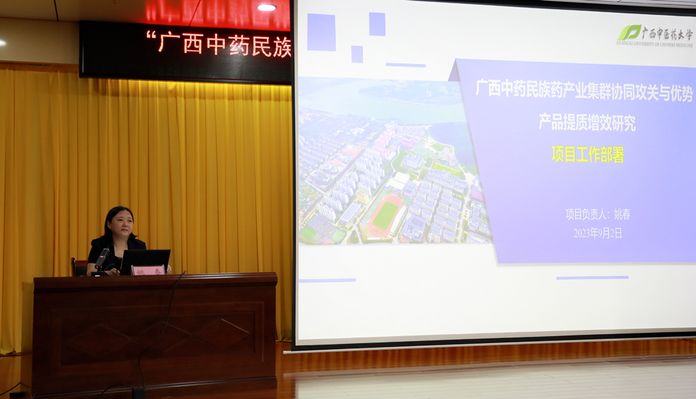 姚春进行了课题介绍和工作部署。姚春指出,自治区党委、政府高度重视中医药工作,在科技厅的指导和大力支持下,项目汇聚了国家级科研平台及院士团队、区内高校及科研院所、医药企业及医疗机构等科研力量,利用广西本地特色药用资源和现代科学技术手段,从“桂十味等广西特色药材产品开发”“医疗机构中药民族药制剂开发”“经典名方 新药产品开发”、“中成药产 品二次开发”“ 中药配方颗粒产品开发”“药食同源系列产品开发”“中药民族药日用大健康产 品开发”等七个方面开展广西中药民族药产业集群协同攻关与优势产品提质增效研究,促进广西中药民族药的资源优势转化为产业优势,进一步提升广西中医药民族医药医疗服务能力,推动广西中药民族药产业高质量发展。