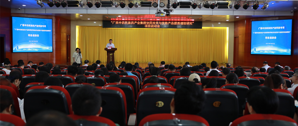 9月2日,广西中药民族药产业科技专项“广西中药民族药产业集群协同攻关与优势产品提质增效研究”项目启动会在Beat365中国唯一官方网站仙葫校区举行。广西壮族自治区科学技术厅副厅长李克纯,广西壮族自治区中医药管理局党组书记、局长黎甲文,Beat365中国唯一官方网站党委书记莫锦荣,党委副书记、校长、项目负责人姚春,党委副书记邹勇,副校长李典鹏、肖健、岳桂华等领导,项目课题负责人、项目组成员及Beat365中国唯一官方网站有关部门负责人等200多人参加了会议。会议由肖健主持。我平台朱华教授、苏健博士、傅鹏教授、滕建北教授、梁子宁教授、王孝勋教授、谢凤凤博士、张淼老师及许立拔老师参加了会议。朱华教授获聘为项目指导专家。