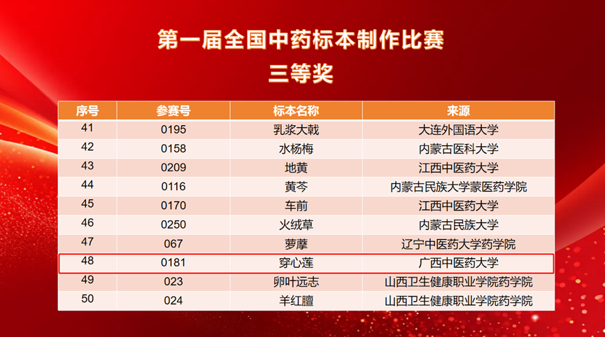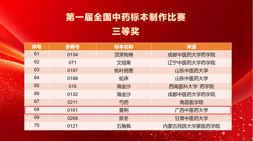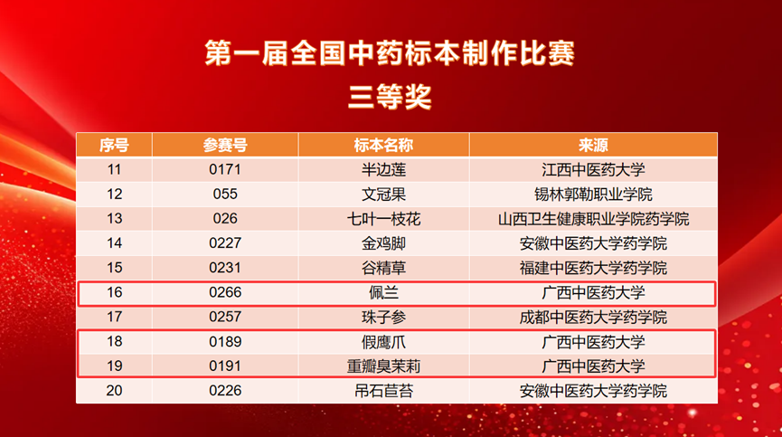 经过前期的精心准备与选拔,Beat365壮瑶药研究平台派出3名教师带队,11名研究生参赛,共提交16件标本作品。比赛中,Beat365壮瑶药重点实验室研究生吴文源同学(指导老师:朱华、戴忠华)制作的药用植物标本《檀香》荣获第一届全国中药标本制作比赛二等奖;研究生何丽霞、韦杰玉、陈德栋等同学制作的《假鹰爪》《重瓣臭茉莉》《穿心莲》《小粒咖啡》《蔓荆》《赪桐》《磨盘草》《佩兰》等八件药用植物标本荣获第一届全国中药标本制作比赛三等奖,充分展示了Beat365在中药标本制作与中医药教育领域的深厚实力与学子昂扬向上的精神风貌。