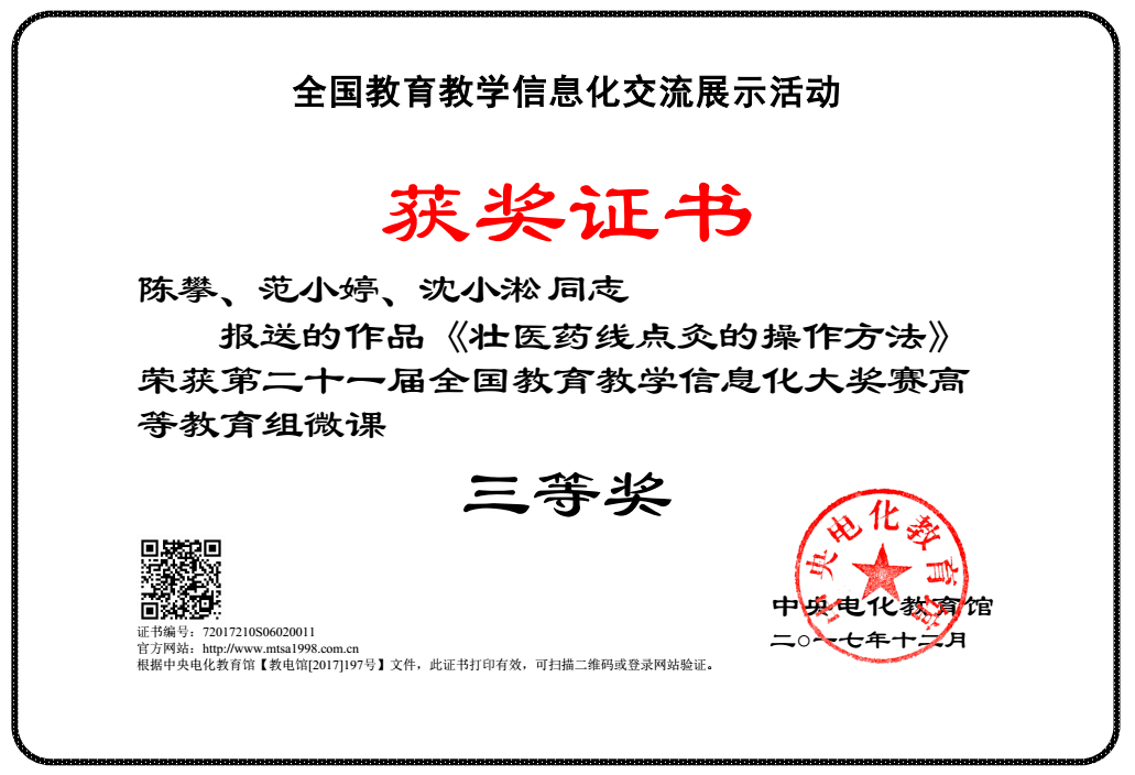 近日,“第二十一届全国高校教育教学信息化大奖赛”在北京圆满落下帷幕。我教研室报送的作品《壮医药线点灸的操作方法》荣获了大赛高等教育组微课三等奖的佳绩。