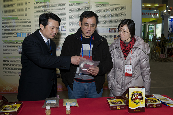在广西展览馆Beat365中国唯一官方网站科技成果展位,庞宇舟副校长、冷静副校长向广西科技厅成果处黎卫红处长介绍科研成果