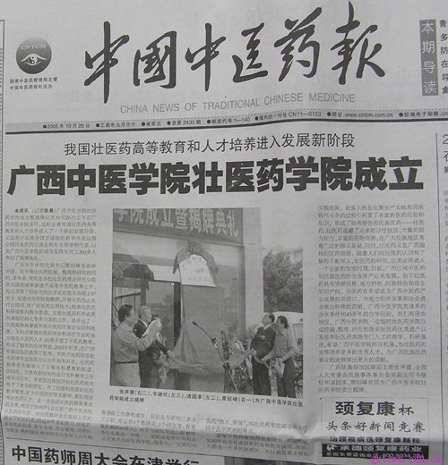 广西中医学院党委书记覃绍峰在致辞中说,在开展壮医药挖掘、整理和研究的同时,多年来,我院逐步把壮医药理论研究与临床实践的成果渗透于高等中医药教育之中,先后开展了招收中国医学史壮医方向硕士研究生,促进壮医药挖掘整理;开展壮药线点灸疗法培训,推广壮医药应用技术;探索壮医药科研成果向教学渗透,实现壮医药科研成果向课程的转化等多方面的工作,培养出了一大批既熟练掌握传统中医药学理论知识和技能,又初步掌握壮医药理论和诊疗方法的地方特色中医药人才,拓展丰富了中医药教育,形成了独有的办学特色。2002年秋季,经广西壮族自治区教育厅批准,我院开始招收首批中医学专业壮医方向五年制本科生,壮医药教育首次被纳入了正规本科教育的轨道。2003年,在教育部对我院进行本科教学工作水平评估中,专家组对我院开创壮医药教育给予了充分的肯定。为了加强和规范壮医药教学管理,扩大壮医药的学术影响,更好地培养壮医药人才,进一步促进壮医药教育事业的发展,我院于2005年4月在原广西中医学院壮医药研究所、壮医药教研室的基础上正式成立了壮医药系。经过半年多的努力,壮医药系在机构组建、教学管理、学生管理、师资队伍建设、教材建设、科学研究以及硕士点申报等方面工作卓有成效,目前各方面均已步入了正轨,现设有4个教研室、1个研究室,有专兼职教师40多人。为了与我院其他二级教学单位名称进一步统一,学院决定将壮医药系正式更名为壮医药学院。他表示,一定要把壮医药“做大、做强”,将壮医药学院建设成为广西中医学院新的亮点。